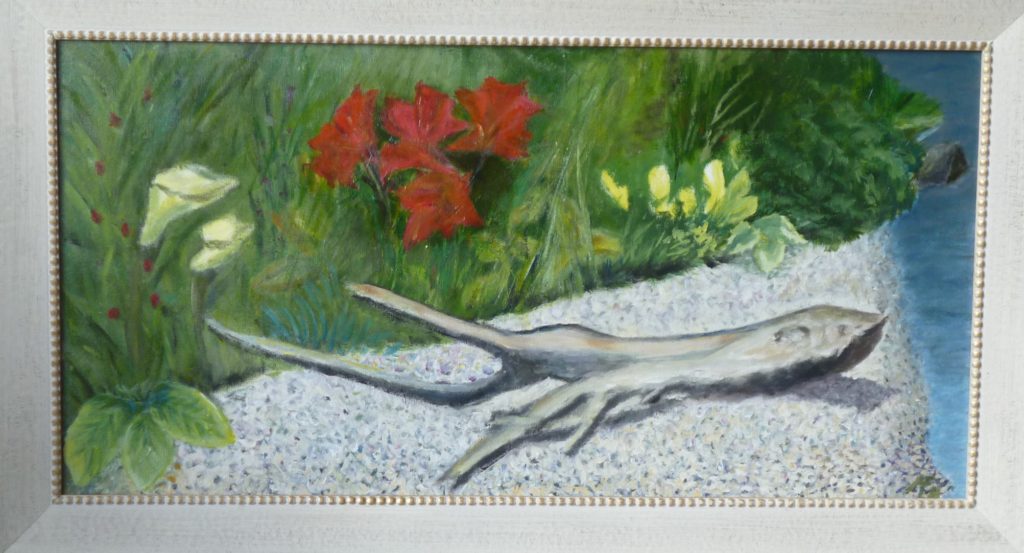 Die Idee zu diesem Bild hatte ich bei einer Wanderung in einer Klamm. Während das Wasser unten im Fluss rauschte, sah ich, dass auch aus der Felswand neben mir an verschiedenen Stellen Wasser hervorquoll. Es war ein bewegtes Bild. Es faszinierte mich. Diesen Eindruck habe ich mit Pinsel und Wasserfarben später im Atelier nachempfunden. Die Glanzlackierung verstärkt die Brillanz.